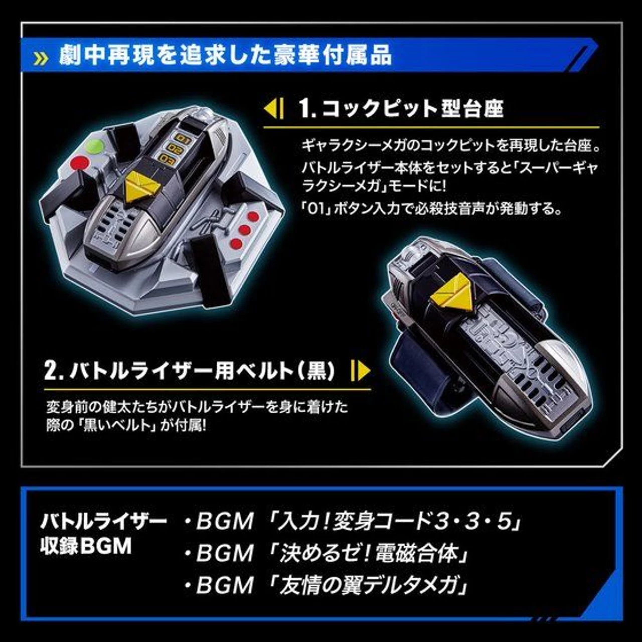 Also equipped with the theme song · BGM playback function. In “Digitizer”, the opening song “Electromagnetic Squadron Megaranger”, the ending song “I feel good”. “Battle riser” can play BGM “input! Transformation code 3 · 3 · 5”, “decision making! Electromagnetic combination”, “winged delta mega of friendship”.